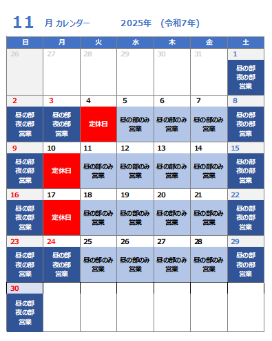 【夜の部の営業日は下記のカレンダーでご確認ください。】