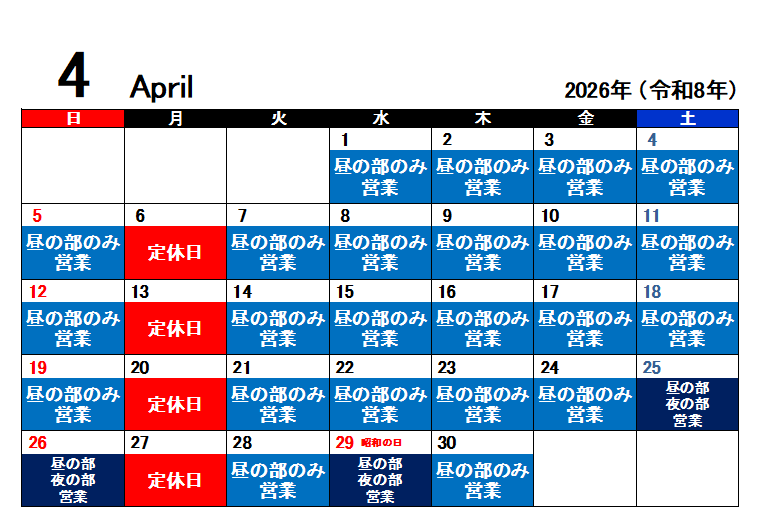 4月の営業時間のご案内